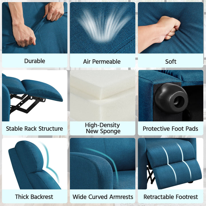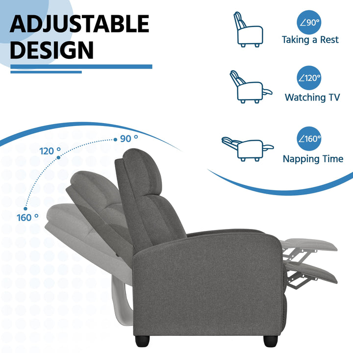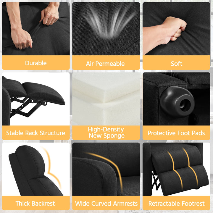 Our Fabric ?Recliner will be your new go-to place for leisure time. Crafted with a ?sturdy engineered wood frame, plush fiber fills, high-density foam, ?resilient pocket springs, and a durable linen-like polyester cover, this ?recliner chair boasts elegance and longevity. Able to support up to 265 ?lb, its solid construction ensures it will be a favorite for years to ?come. Picture yourself sinking into the marshmallow-soft seat and plush ?backrest after a long, tiring day. Designed to melt away your fatigue, ?this recliner offers the ultimate relaxation. It's like having your very ?own comfort oasis in the living room, bedroom, home theater, office, or ?anywhere you please!?