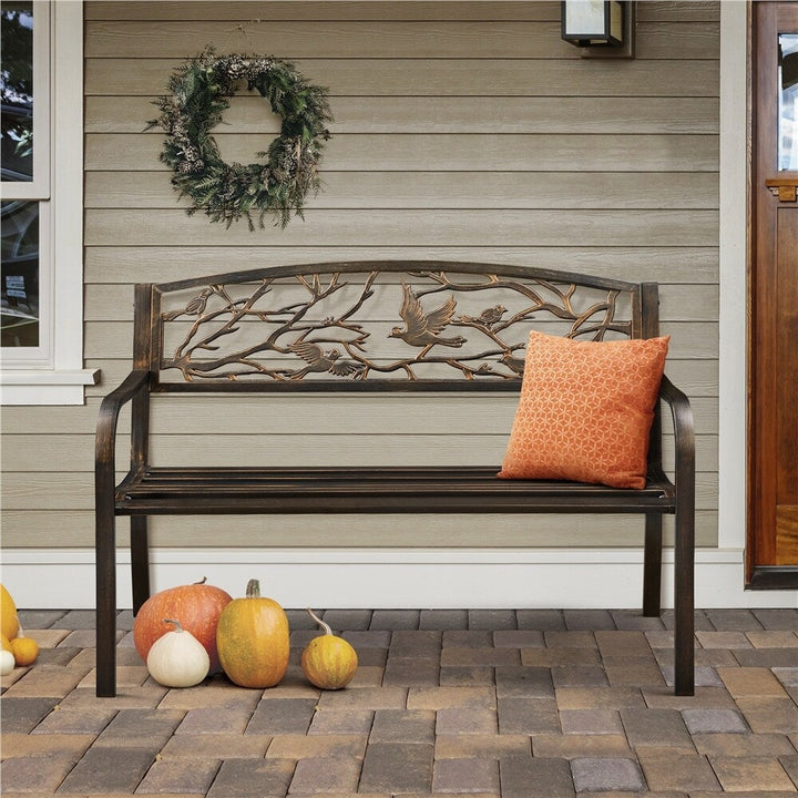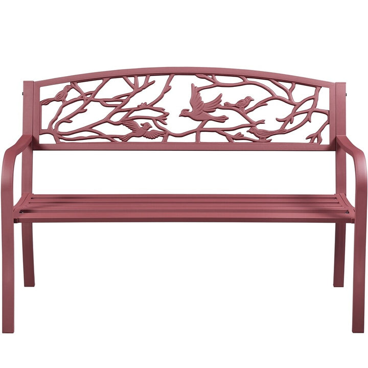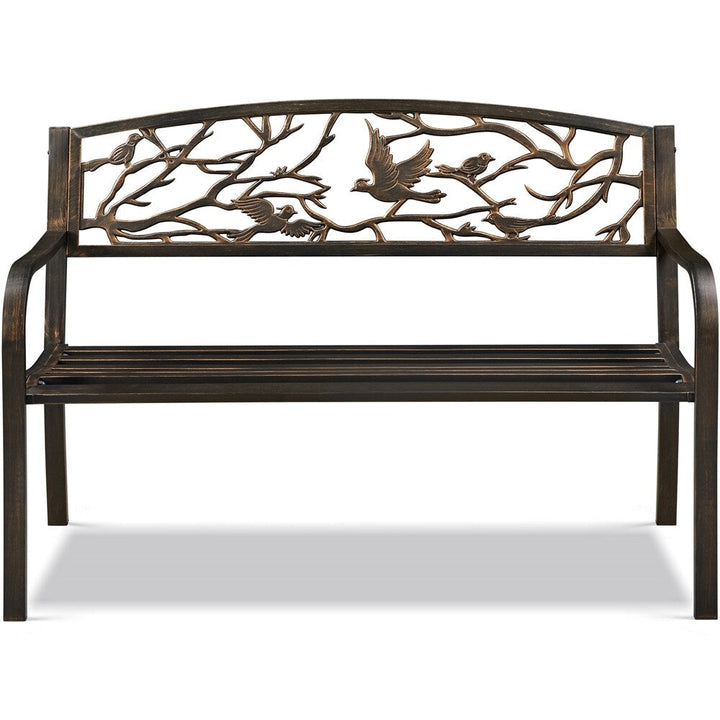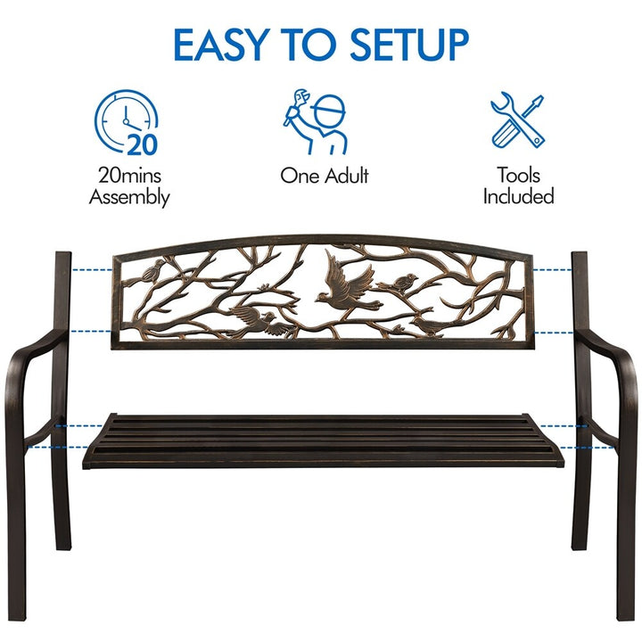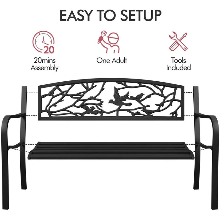 Bring a touch of nature to your outdoor living space with our Yaheetech 50' Patio Garden Bench. The vintage bird pattern on the backrest adds beauty and allows airflow, while the slightly curved seat is wide and deep for comfortable sitting. Made of sturdy iron with a protective waterproof coating, this bench is heavy-duty-oriented and durable enough for long-term usage. With a maximum load of 180kg/397lb, it's suitable for parks, backyards, gardens, wedding settings, and more. The armrests are curved for comfort, and the seat is thoughtfully designed with vertical stripes for better circulation and weight distribution. All-weather finish ensures durability in any weather condition, and assembly is easy with included tools and instructions.