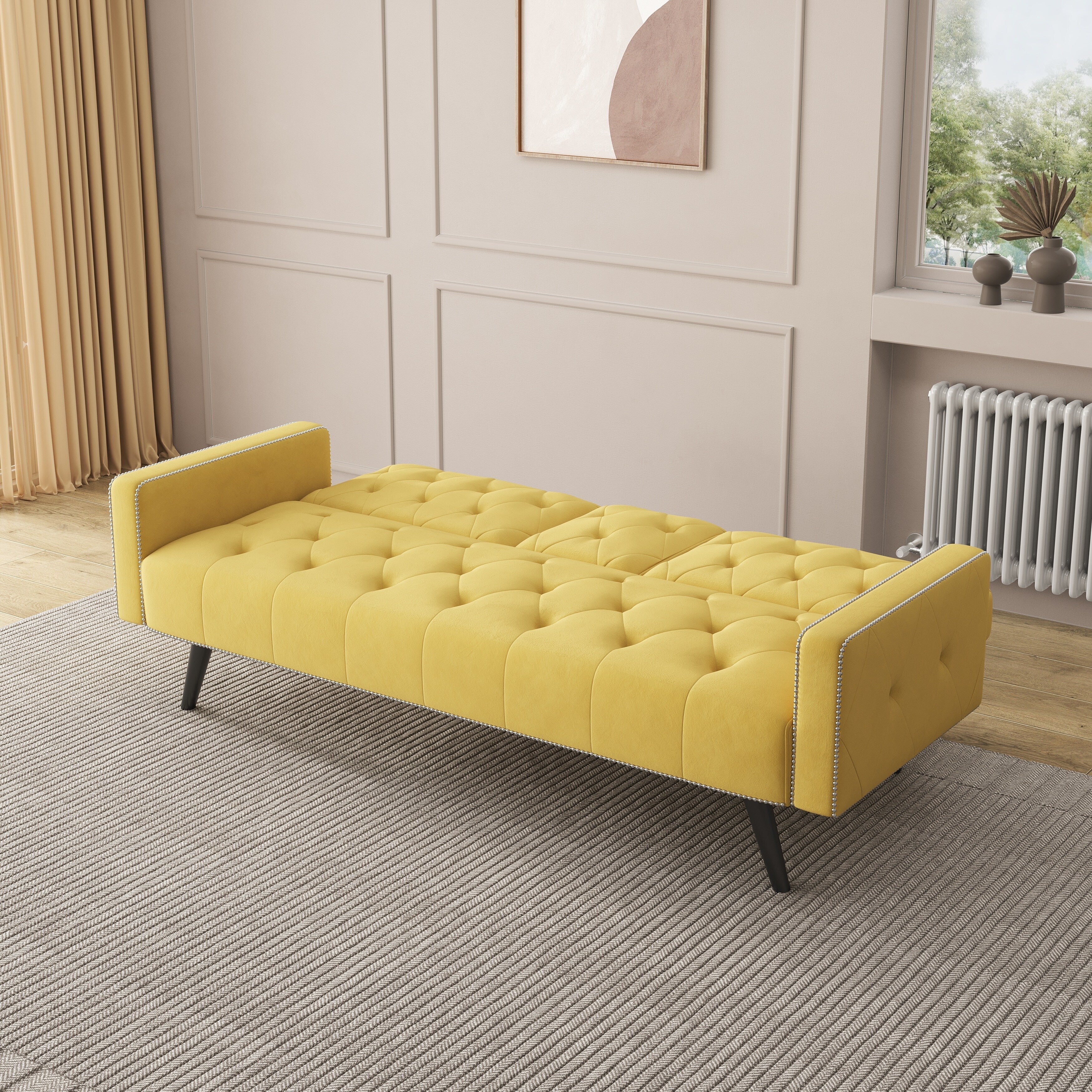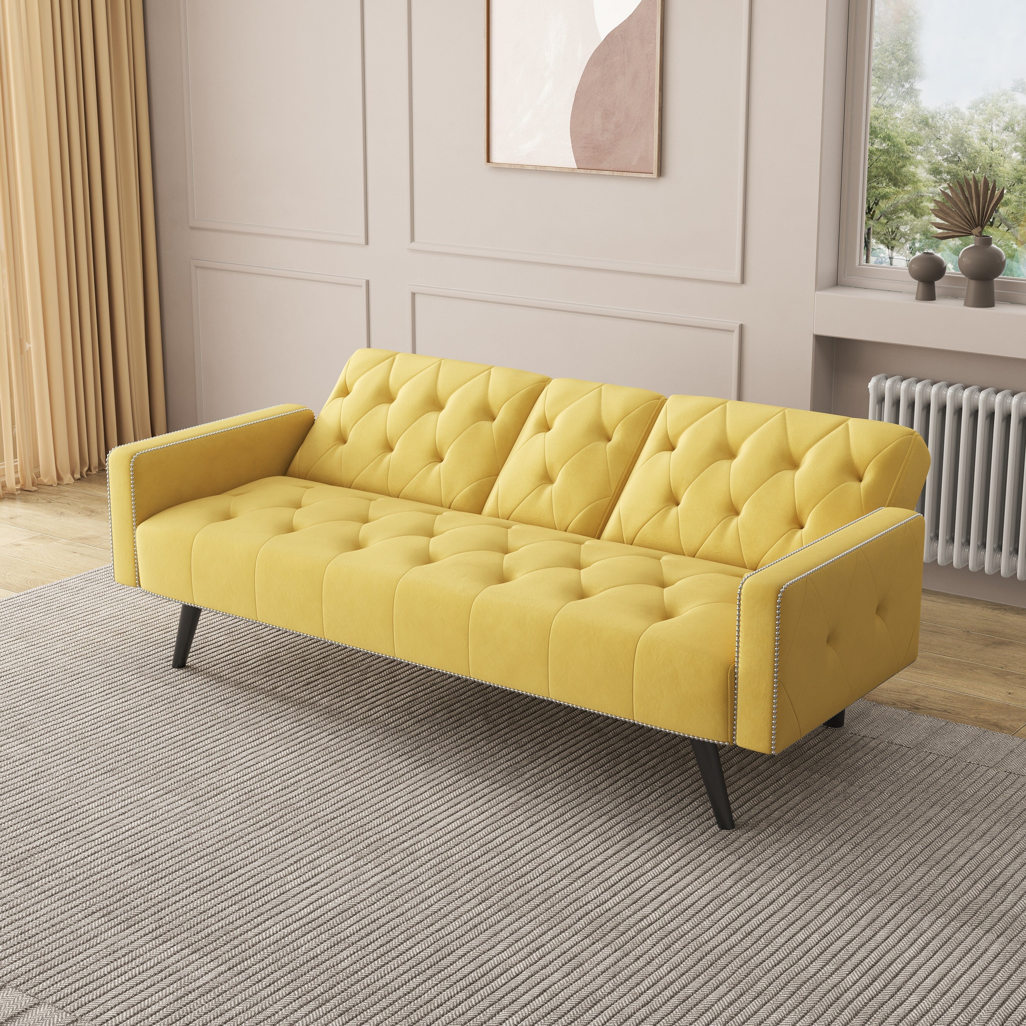 Yellow Velvet 3-seater Sofa Bed with Nailhead and Cup Holders