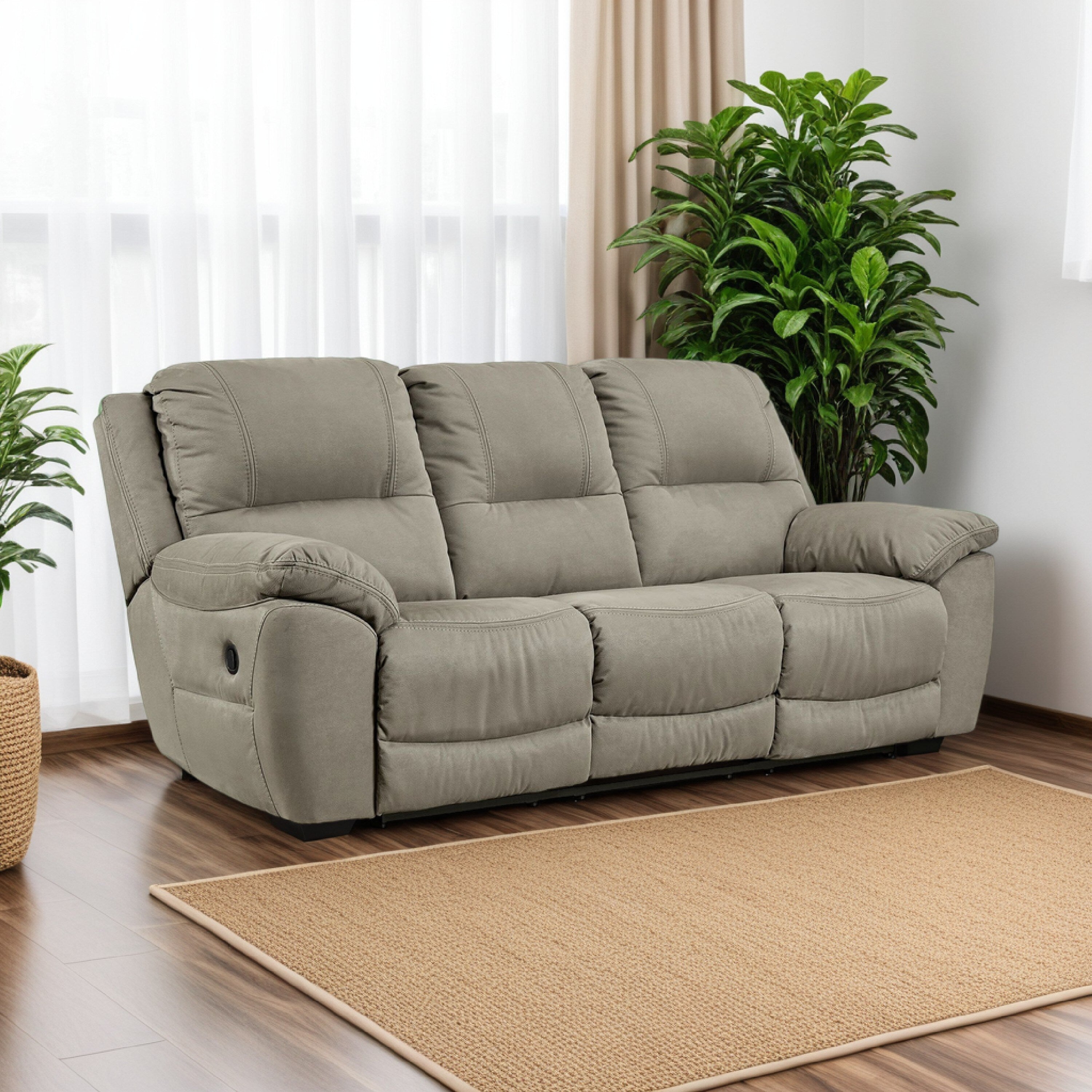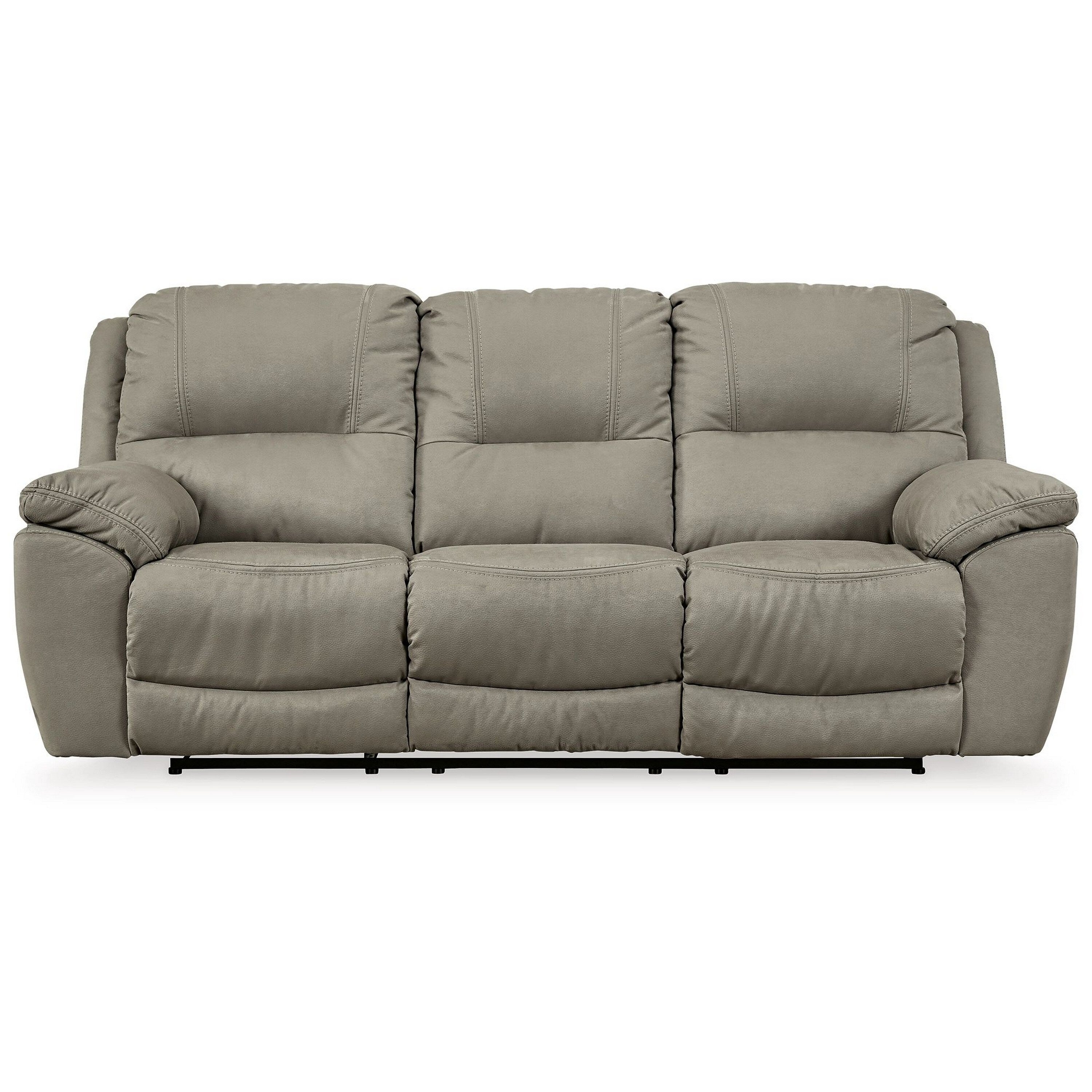 Enhance your lounging experience with this reclining sofa. Crafted from soft putty gray faux suede, it features plush pillow-top arms, and a supportive bustle back. The smooth pull-tab reclining mechanism allows for easy adjustment. Its zero-wall design provides space-saving convenience, making it a perfect fit for any room. Check out our Zane collection for more.