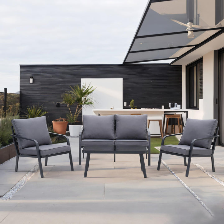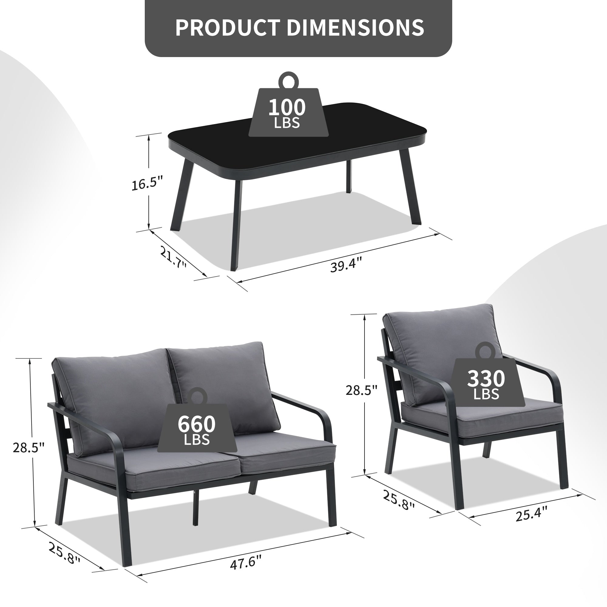 ?Zenova 4 pieces modern patio furniture set is made of a powder-coated aluminum frame that is both solid and durable while being lightweight for easy handling and storage. The surface of aluminum will naturally form an oxide layer and can protect itself from rusting, fading, and corroding in all kinds of weather.? -