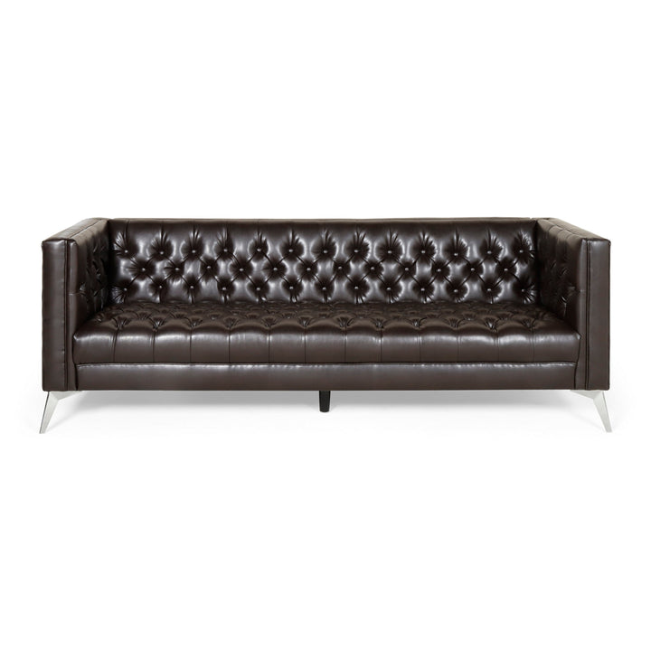 Elevate your living space with our Zexy modern sofa, designed for both durability and style. This three-seater features striking button-tufted diamond stitching and sleek, clean lines. It is upholstered in plush dark brown faux leather. With tuxedo armrests and T-shaped chrome iron legs, it exudes contemporary elegance. Check out our Zexy collection for more.