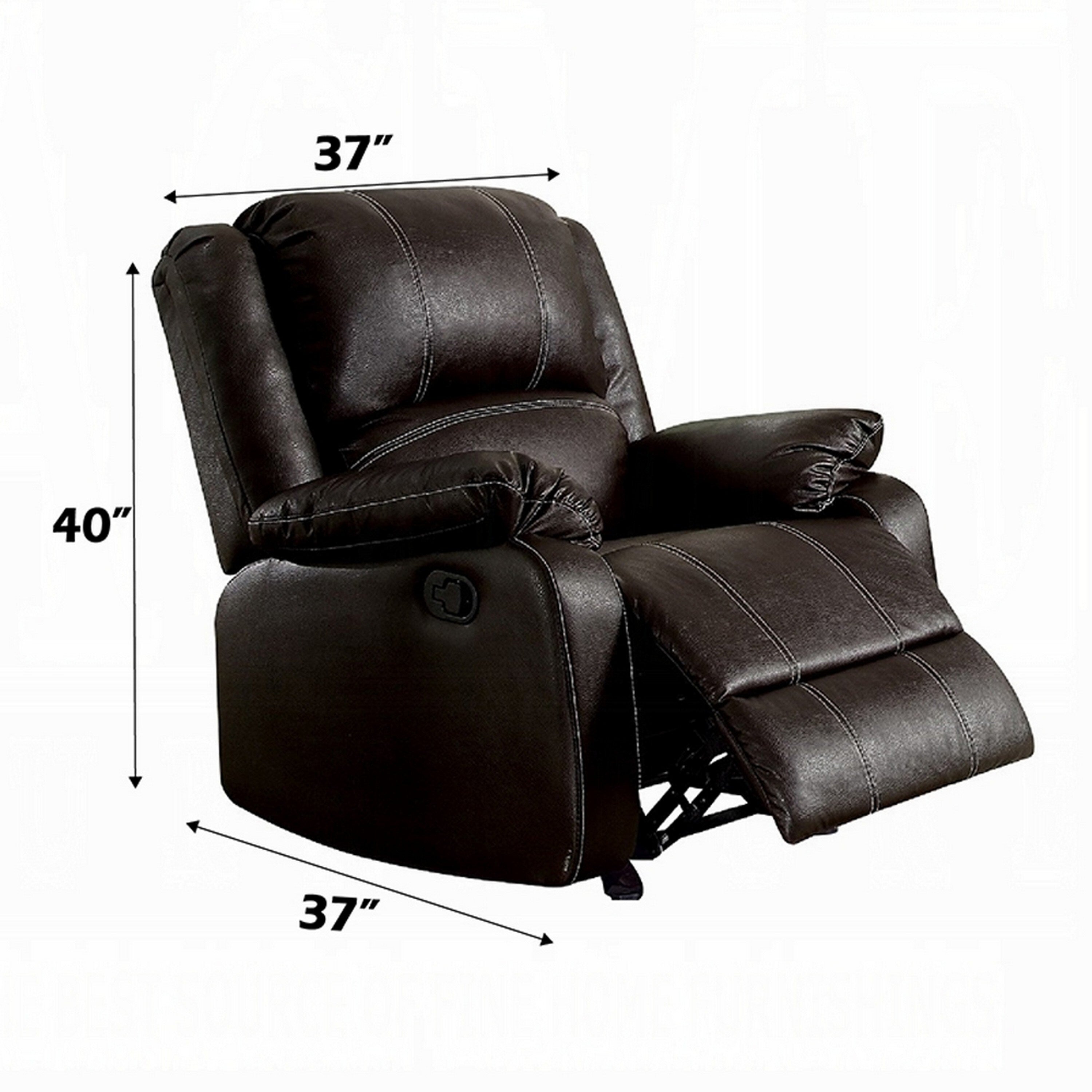 Enhance your living space with our Zuru motion recliner chair. This recliner is crafted from durable metal and boasts a sleek design, creating a more open feel. It features a smooth motion reclining mechanism for effortless adjustments, plush pillow-tufted brown faux leather upholstery, and tight pillow-top armrests. Check out our Zuru collection for more.