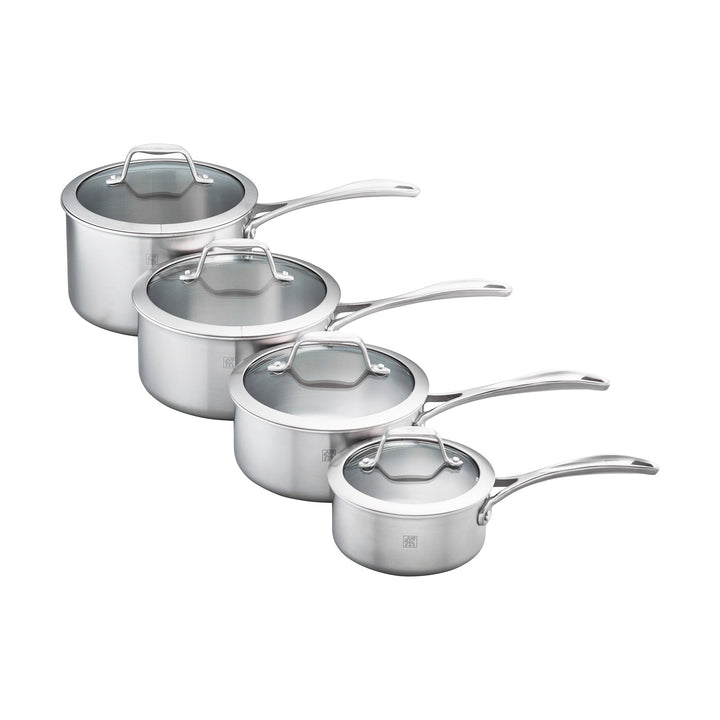 ZWILLING Spirit 3-Ply gets you in the mood to cook. Thanks to a thick, aluminum core, these versatile pans are fast-heating and boast an even cooking surface. The exclusive, stay cool handles are designed for easy maneuvering with oven mitts and the dripless pouring rims help prevent kitchen spills. The tight-fitting tempered glass lids allow you to effortlessly monitor your cooking.